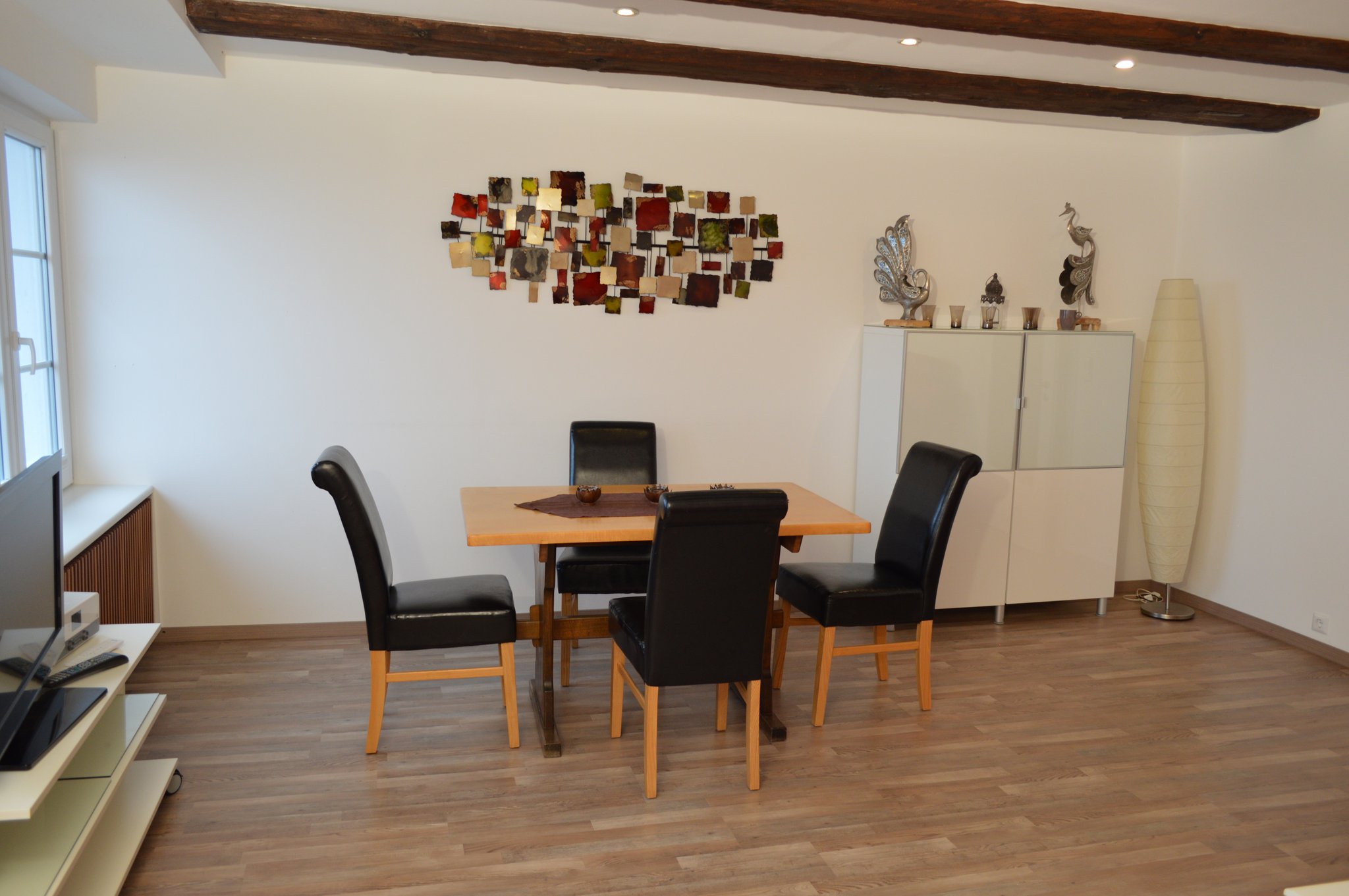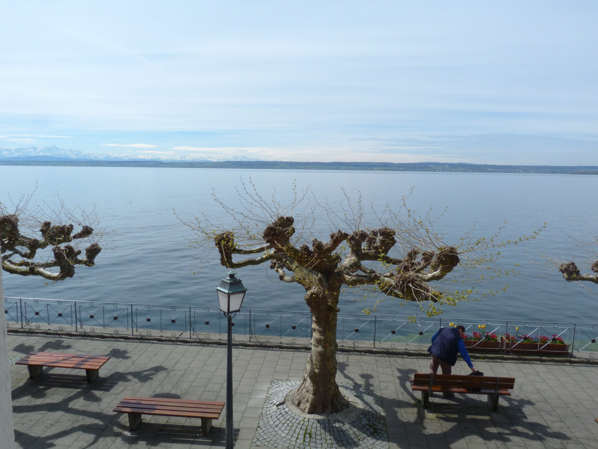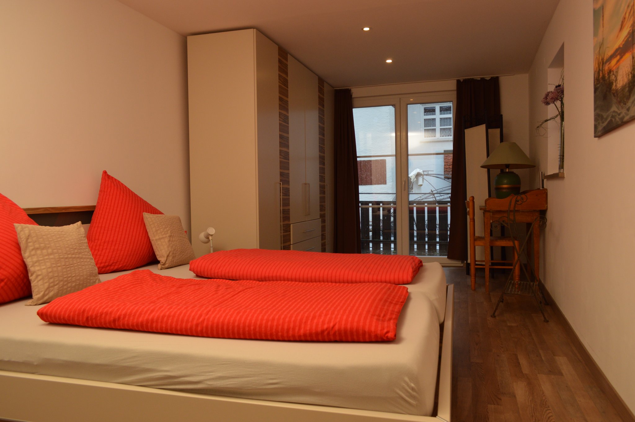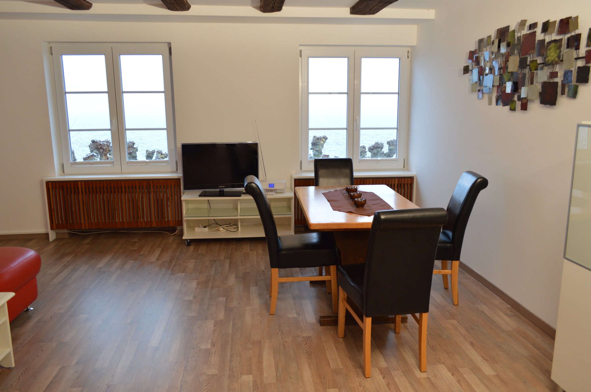 Die 3 Zimmer Wohnung befindet sich im 1. OG und liegt direkt an der Promenade mit Blick auf den See und die Berge. Das Wohnzimmer und ein Schlafzimmer sind Richtung Seeseite und das zweite Schlafzimmer liegt zum Innenhof und hat einen Zugang zur Terrasse. So ist auch gewährleistet, falls gewünscht, ungestört zu schlafen. Diese Wohnung ist unser "Sahnestück", da sie eine fast unschlagbare See- und Bergsicht bietet.